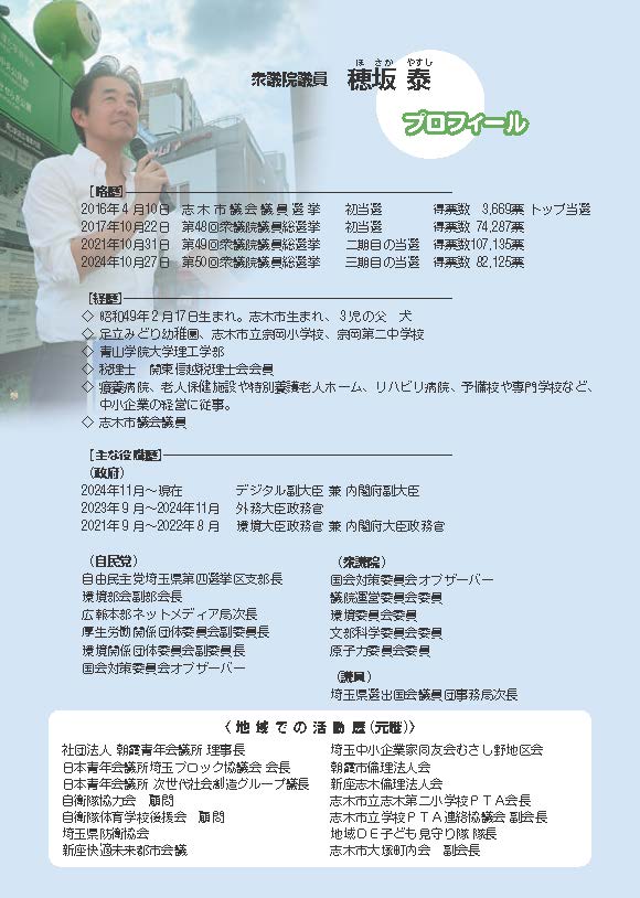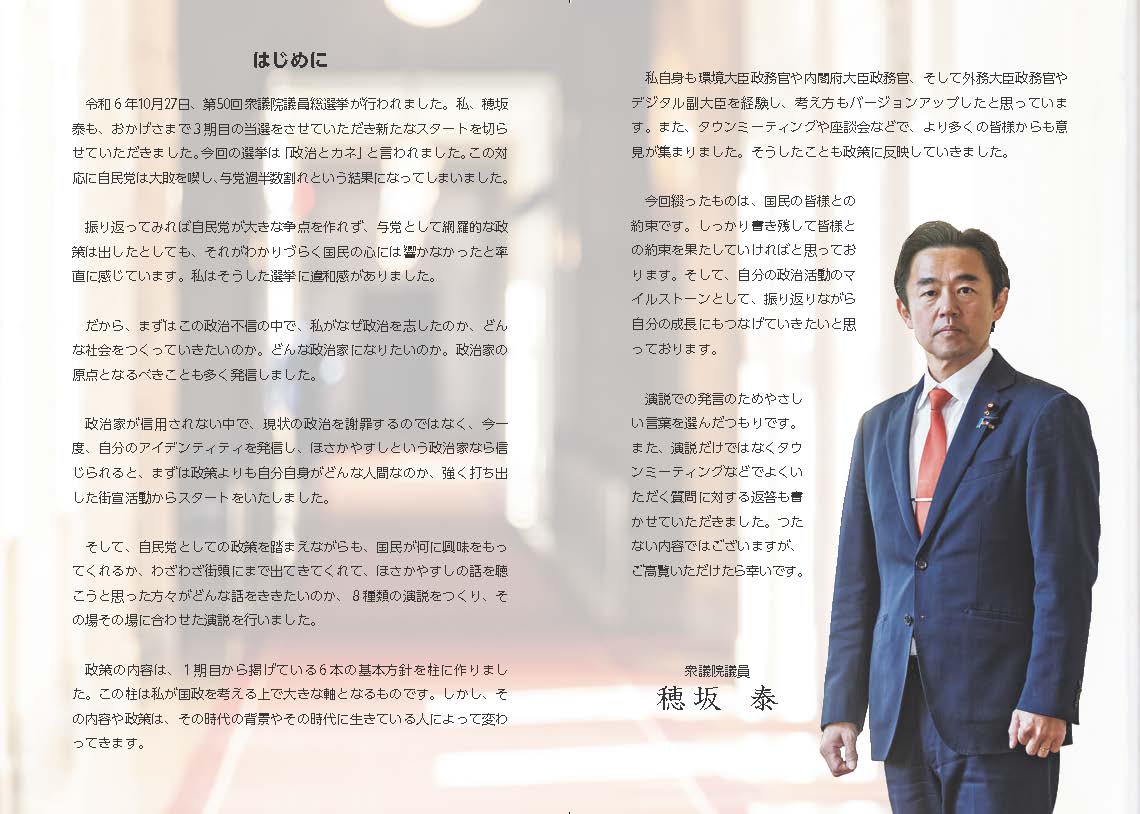 2017年の初当選以来、皆様のご指導をいただき常に邁進してまいりました。2026年、新たなステージに向けて穂坂泰のVisionを発信いたします。この方針を軸に、様々な経験を積み重ね強くやさしい日本をつくってまいります。