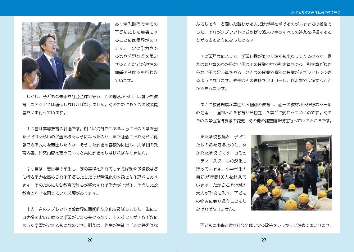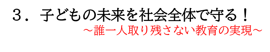 「希望する全ての子ども達の学びを守る。子育て負担の軽減を図り、社会全体で子どもを育てる環境をつくる。」