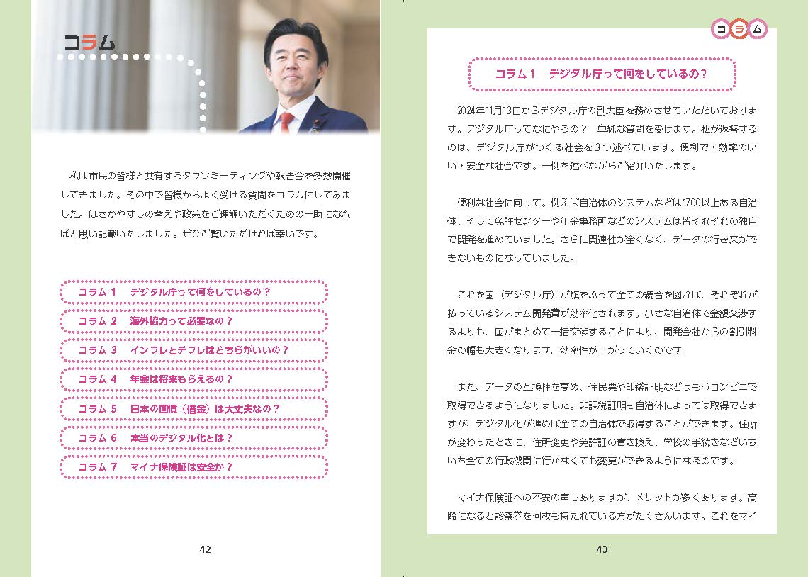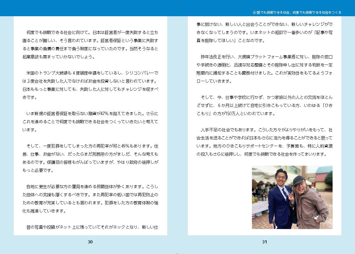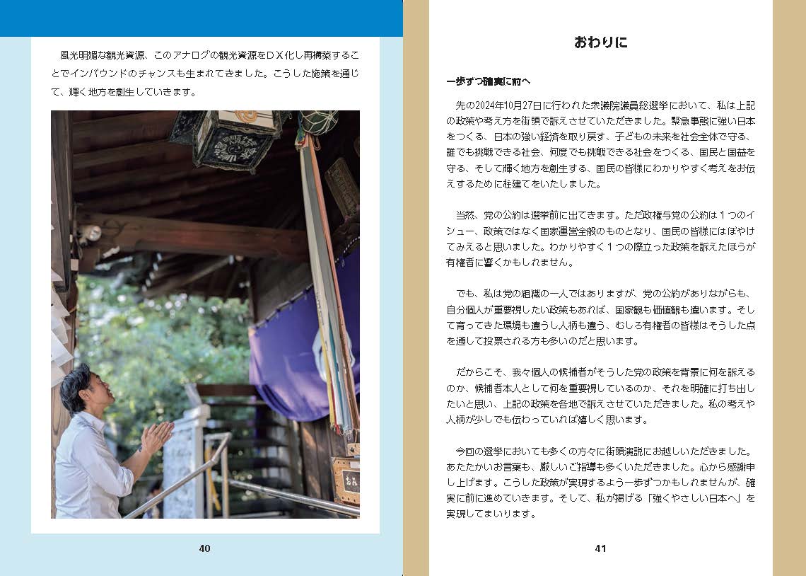 政治は20年後の未来をつくる仕事だといわれます。だからこそ、20年後に責任がもてる私たちの世代が変えていかなければなりません。私は、この今までの経験と人脈、そして8年間の議員活動で得た力でこの国を変えていきます。
